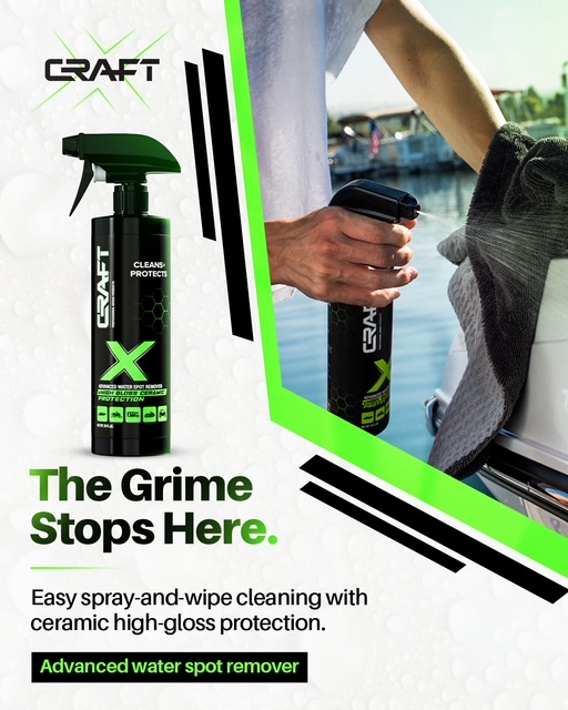 Craft X Next Generation 2N1 cleaner and protector is THE product to revitalize your boat’s exterior. Specifically CRAFTED to remove water spots while adding a layer of Si02 ceramic protection, our formula also cuts through lake grime while leaving a streak free show quality shine. All with no nasty odor.